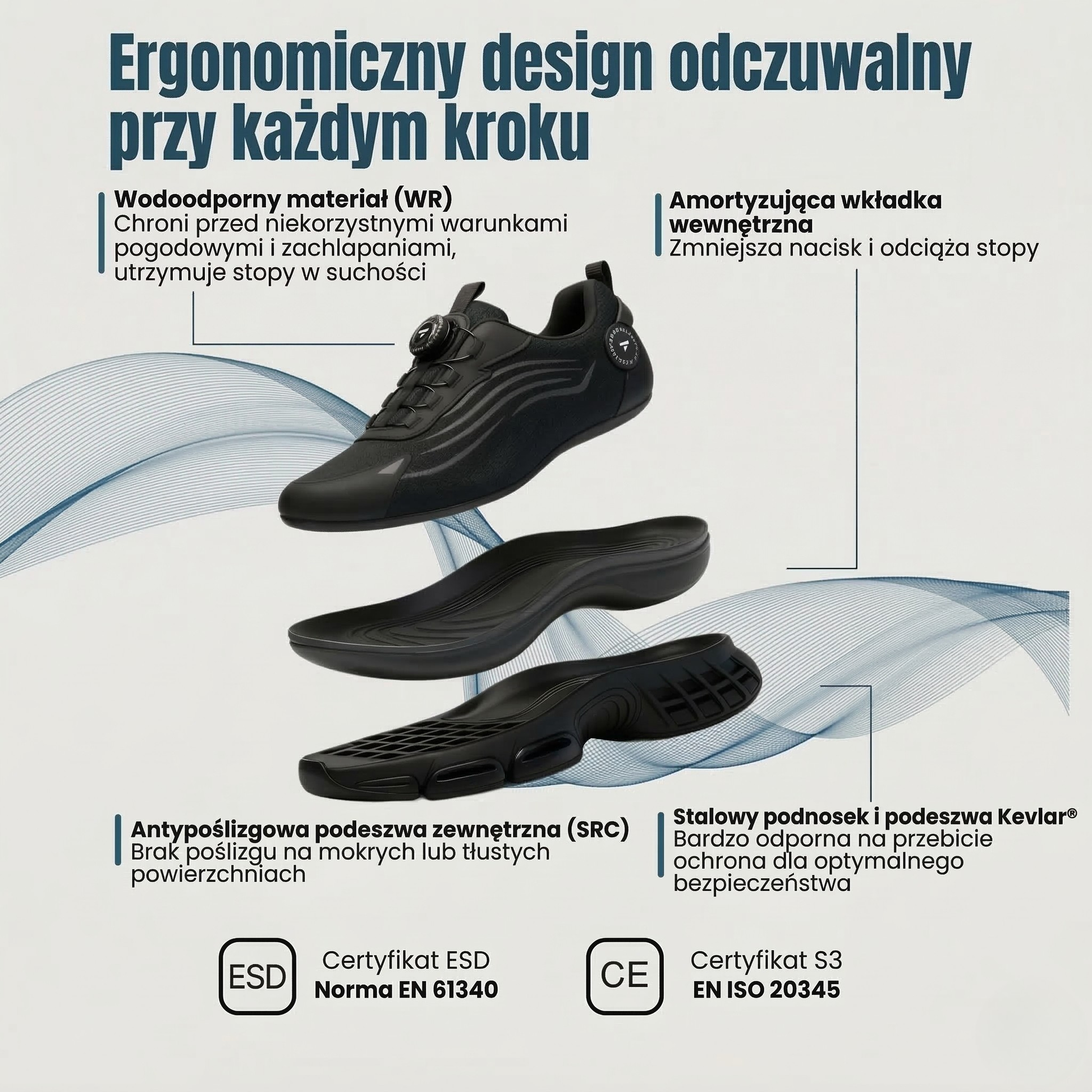 Nasze buty posiadają certyfikat EN ISO 20345 S3: stalowy podnosek, wkładka antyprzebiciowa z Kevlaru, antystatyczne ESD, wodoodporne WR oraz antypoślizgowe SRC.